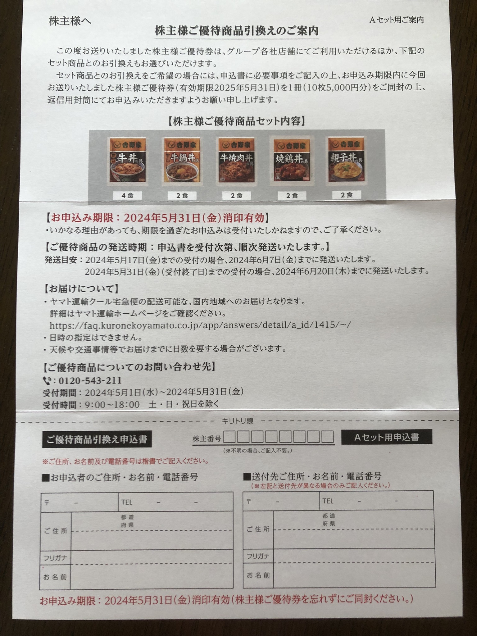 9861吉野家HDより優待が2名義(200株×2)到着しました(5/2木)。