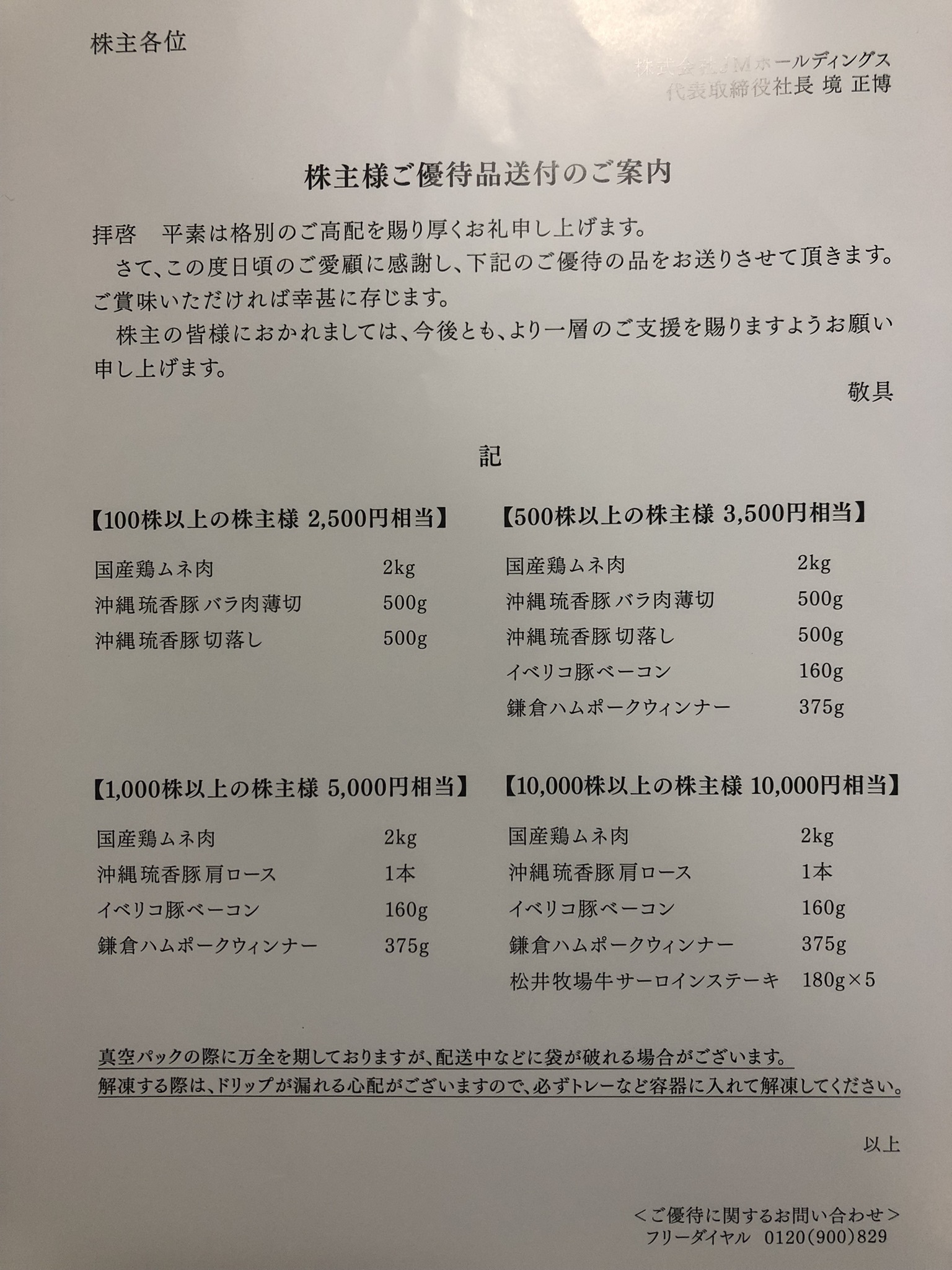 先日いただいたJMホールディングスの優待で引換えた(ハガキを返送しなかった)優待品が2名義到着しました(11/26水)。