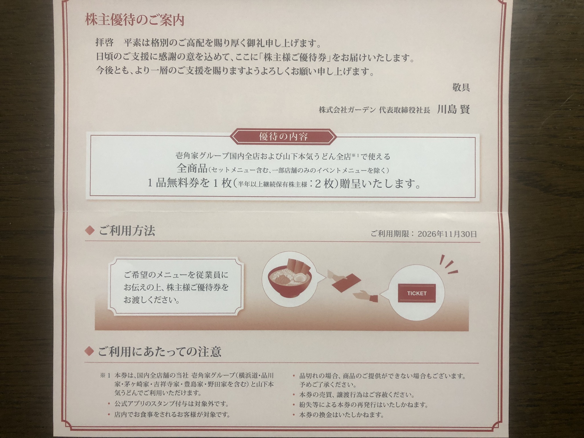 100株の優待内容は、壱角家、山下本気うどんで利用できる全商品1品無料券1枚です。また、同社は長期保有株主優遇銘柄であり、半年以上の保有で無料券2枚がいただけます。タップで拡大