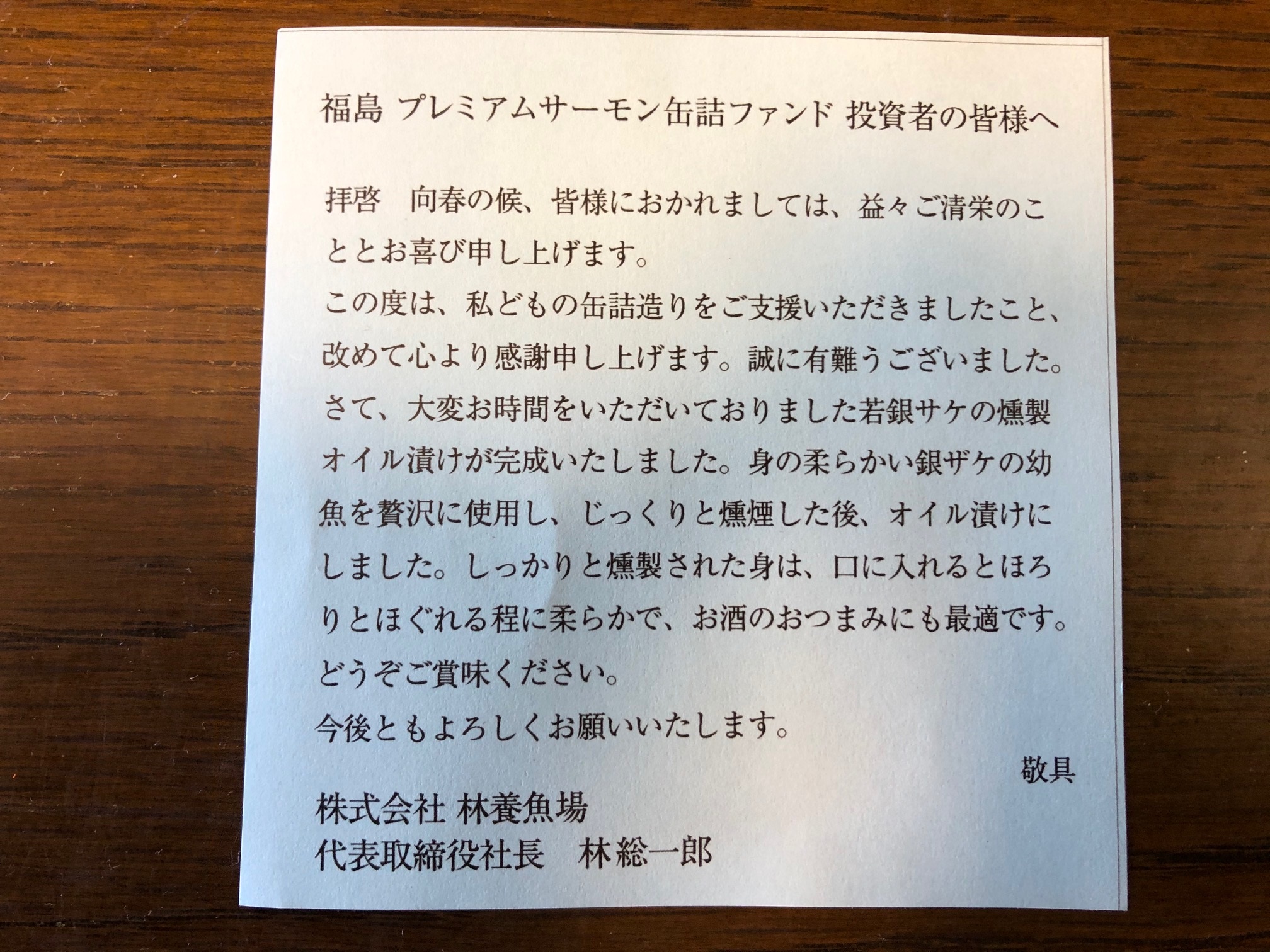 “林養魚場 プレミアムサーモン缶詰ファンド★投資家特典到着” への1件の返信